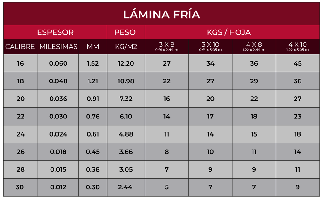 TABLA DE MEDIDAS Y CALIBRES DE LÁMINA CALIENTE Y FRÍA