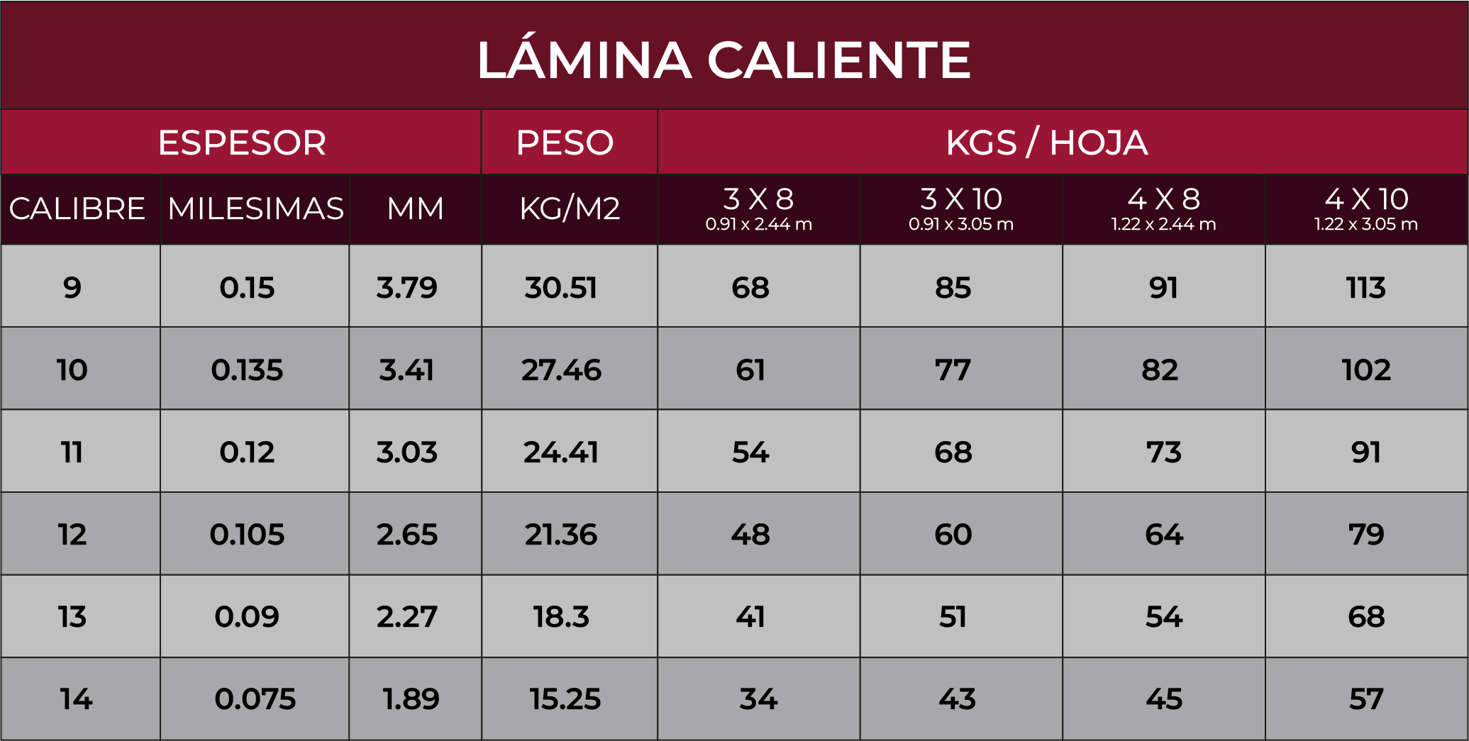 TABLA DE MEDIDAS Y CALIBRES DE LÁMINA CALIENTE Y FRÍA